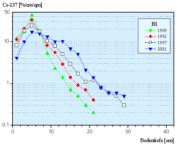 Auf den Probeflächen B1 und F1 wurden seit 1989, in mehrjährigen Abständen Bodenprofile entnommen und die vertikale Verteilung von Cs-137 ermittelt.