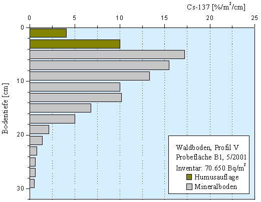 In Bodenprofilen aus den drei Untersuchungsgebieten befanden sich in den Jahren 2000/2001, durchschnittlich noch 56% des Cs-137 Inventars in den obersten 10 cm und 93% in den obersten 20 cm. Als Beispiel ist in der Abbildung 5 die volumenbezogene Tiefenverteilung von Cs-137, bezogen auf die insgesamt in dem Bodenprofil enthaltene Aktivität eines Profils der Fläche B1 dargestellt. Deutlich ist zu sehen, das sich der überwiegende Teil des Cs in den obersten 10 cm des Bodens befindet. Dies ist genau der Bodenbereich, aus dem die meisten Waldpflanzen und auch Bäume ihre Nährstoffe aufnehmen. Da Cäsium in der Humusauflage wesentlich besser pflanzenverfügbar ist als im Mineralboden, ist der Transfer des Nuklids in Pflanzen auf Waldstandorten langfristig gesehen relativ hoch. Da sich viele Wildtiere von diesen Waldpflanzen ernähren, sind sie in den von dem Tschernobyl-Fallout besonders betroffenen Gebieten ebenfalls erhöht mit Radiocäsium kontaminiert.