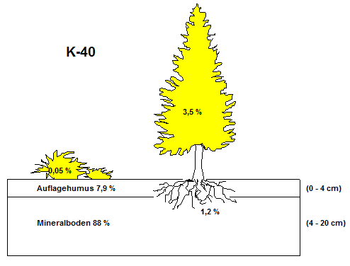 Der K-40 Vorrat betrug insgesamt 55.800 Bq/qm. Davon waren nur 2.600 Bq/qm in der Biomasse der Fichte vorhanden, der überwiegende Teil war, mit 1.200 Bq/qm im Holz gebunden. Die Vorräte in der Waldbodenvegetation und in Pilzen zusammen waren, mit rund 30 Bq/qm sehr gering, der Vorrat in Tieren spielt, mit weniger als 1 Bq/qm keine Rolle. Nahezu der gesamte K-40 Vorrat, nämlich 53.200 Bq/qm befand sich im Boden (0 – 20 cm), wobei der Anteil im Mineralboden, mit 48.800 Bq/qm, 11mal höher war als der in der Humusauflage, mit 4.400 Bq/qm.