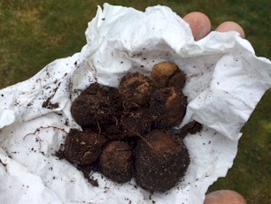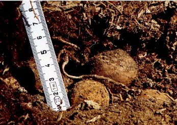 Abb. 2: Freigelegte Hirschtrüffel (Elaphomyces granulatus) in 8 cm Bodentiefe. Bodenmais, Probefläche B1,