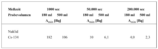 Im Folgenden sind ausgewählte Messwerte der Cäsium 134 Aktivität aus früheren, eigenen Forschungsvorhaben und solchen im Auftrag des BMU angegeben. Die gammaspektrometrischen Messungen erfolgten am damaligen Zentralen Isotopenlabor der Universität Göttingen an Reinstgermanium-Detektoren. In der Tabelle 1 sind die Nachweisgrenzen der Aktivitäten für verschiedene Messgeometrien, bei unterschiedlichen Messzeiten beispielhaft für den verwendeten Reinstgermaniumdetektor I für Cäsium 134 angegeben.