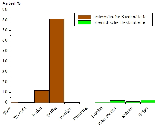 Umgekehrt bewirkt die vermehrte Aufnahme von Bucheckern, im Verhältnis zu anderen Nahrungsbestandteilen, eine deutliche Reduktion der aufgenommenen 137Cs Aktivität. Bei einer Aufnahme von 1 Kilogramm Nahrung mit 80% Bucheckern werden nur 320 Becquerel 137Cs zugeführt. Die Variabilität der 137Cs Aktivität von Hirschtrüffeln ist im Untersuchungsgebiet sehr hoch, wodurch der 137Cs Input der Wildschweine entsprechend unterschiedlich ist. Wird die Rechnung zum Beispiel mit 30% Trüffeln an der Nahrungsmenge, bei einer Kontamination von 40.000 Bq/kg (die in einigen Teilen des Untersuchungsgebietes durchaus realistisch ist) durchgeführt, ergibt sich bei 3 kg Nahrungsmenge eine 137Cs Zufuhr von 37.722 Bq/d. In der Abbildung 3 sind die Beiträge der einzelnen Nahrungsgruppen an der 137Cs Zufuhr dargestellt, wobei die Anteile der ober- und unterirdisch wachsenden Bestandteile farblich unterschiedlich dargestellt sind.