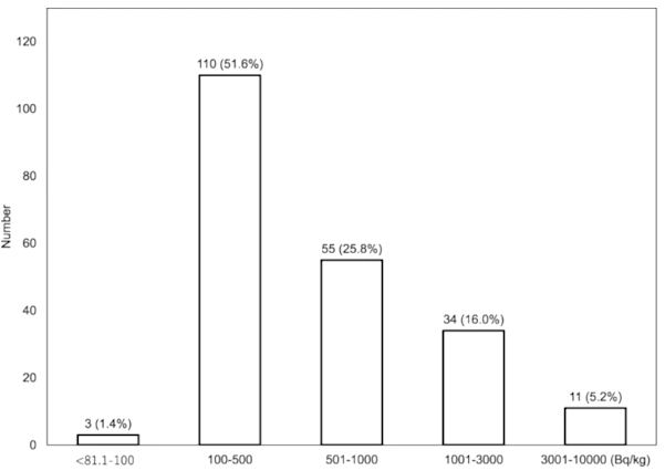Der Unfall des Kernkraftwerks Fukushima Daiichi (FDNPP) im Jahr 2011 hat große Mengen künstlicher radioaktiver Substanzen in die Umwelt freigesetzt. In einer Studie zur Radiocesiumkonzentrationen in Wildschweinen in Japan haben Cui et. al (2020) die Konzentration von Radiocesium (Cs 134 + Cs 137) in 213 Muskelproben von Wildschweinen (Sus scrofa) gemessen, die in der Stadt Tomioka, die sich 20 km vom FDNPP entfernt befindet, gefangen wurden. Die Ergebnisse zeigen, dass 210 (98,6%) Muskelproben immer noch die regulatorische Radiocesium-Grenze (100 Bq/kg) für allgemeine Lebensmittel überschreiten. Die Radiocesiumwerte (Cs 134 + Cs 137) lagen zwischen 87,1 und 8.120 Bq/kg Frischmasse (FM) bei einer mittleren Konzentration von 450 Bq/kg FM.Die Verteilung der Radiocäsiumaktivität ist in der Abbildung 3 dargestellt.