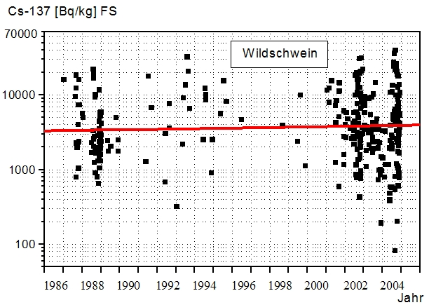 Eine der letzten Altlasten aus dem Tschernobyl-Fallout ist die 137Cs Kontamination von Wildschweinen in vereinzelten Gebieten im Süddeutschen Raum. Bei Wildschweinen ist die Aufnahme von 137Cs mit der Nahrung wesentlich komplexer als bei den reinen Pflanzenfressern Reh und Rothirsch, denn sie nehmen, neben oberirdischer Nahrung auch Bestandteile aus dem Boden auf, je nach Verfügbarkeit und Vorliebe. Dadurch ergibt sich ein zeitlich differenzierter Verlauf der 137Cs Aktivität in Wildschweinen, der in der Abbildung 2 dargestellt ist (Untersuchungsgebiet Bodenmais und einem angrenzenden Jagdrevier in Zwiesel von 1987 – 2003. Die Bodenkontamination ist in beiden Gebieten ähnlich hoch).