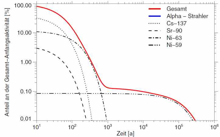 Auch für die Endlagerung von radioaktiven Abfällen ist Sr 90 ein relevantes Nuklid (Kienzier et al. 1980), BMU.de). Die Abbildung 6 zeigt die zeitliche Entwicklung für das Strontium 90 Aktivitätsinventar für das finnische Endlager Olkiluoto.