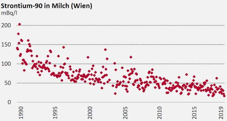 Abb. 3: Sr-90 Aktivität in Rohmilch aus Österreich von 1990 bis 2019. Milchproben bis 1999 aus Wiener Molkereien bzw. der Molkerei Baden und ab 2000 von Milch aus dem Handel. Quelle: ages.at