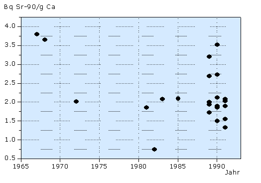 Aufgrund des unterschiedlichen Alters der untersuchten Knochenproben wurde auf eine statistische Auswertung der Daten verzichtet. Die höchsten Sr-90 Aktivitäten wiesen mit 3,8 Bq Sr-90/g Ca bzw. 3,65 Bq Sr-90/g Ca die Proben auf, die aus den 60er Jahren stammten. Die beiden Rehe wurden 1964, also in dem Jahr geboren, in dem weltweit die höchste Deposition von Sr-90 erfolgte. Damit fiel bei diesen Tieren die Hauptwachstumsphase der Knochen mit einer relativ hohen Sr-90 Aufnahme über die Nahrung zusammen. Die Tiere die in den Jahren 1972 bis 1986 erlegt wurden haben in den Unterkiefern geringere Sr-90 Aktivitäten, während dieser Jahre war die Sr-90 Deposition aus der Atmosphäre relativ gering. Der Sr-90 Gehalt der Nahrungspflanzen dürfte damals hauptsächlich durch Wurzelaufnahme bedingt gewesen sein und war daher geringer als in den frühen 60er Jahren, wo Sr-90 direkt auf den Pflanzenoberflächen deponiert wurde. Eine weitere Verminderung der Aktivität erfolgte durch den radioaktiven Zerfall des Nuklids.