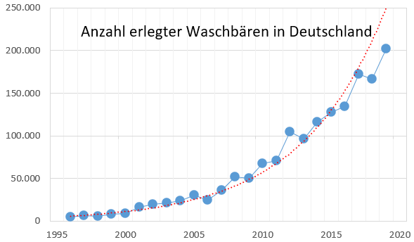 Wie aus der Grafik hervorgeht, sind die Erlegungen von 1995 bis 2020 sehr stark angestiegen. Ein exponentieller Fit beschreibt die Entwicklung bisher relativ gut. In wie weit die Erlegungen ein exponentielles Wachstum des tatsÀchlichen Bestands wiedergeben ist fraglich. Im Jagdjahr 1996/1997 wurden 5.059 WaschbÀren erlegt. 2009/2010 waren es bereits 49.785 Tiere, 2019/2020 dann der bisherige Höchstwert von 202.293 WaschbÀren. Erlegungen von Procyon lotor folgen damit einem Trend bei etlichen Wildarten, die als Kulturfolger ein hohes Anpassungspotenzial an sich verÀndernde Umweltbedingungen zeigen, die Jagdstrecke von Wildschweinen nimmt ebenfalls stark zu.